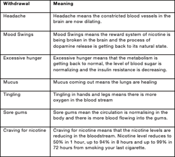 You might hear some propaganda that the withdrawal from quitting smoking is very painful but that’s a lie. I have explained in my book 7 Secrets To Quit Smoking that withdrawal is very mild and it is a sign of healing. Our body is a miracle and heals itself naturally. The suffering is only in the mindset when someone feels that he or she has given up something precious by quitting smoking, but the truth is that you are not giving up something but doing yourself a favor by quitting smoking. Some of the withdrawal symptoms and their meanings are as follows-